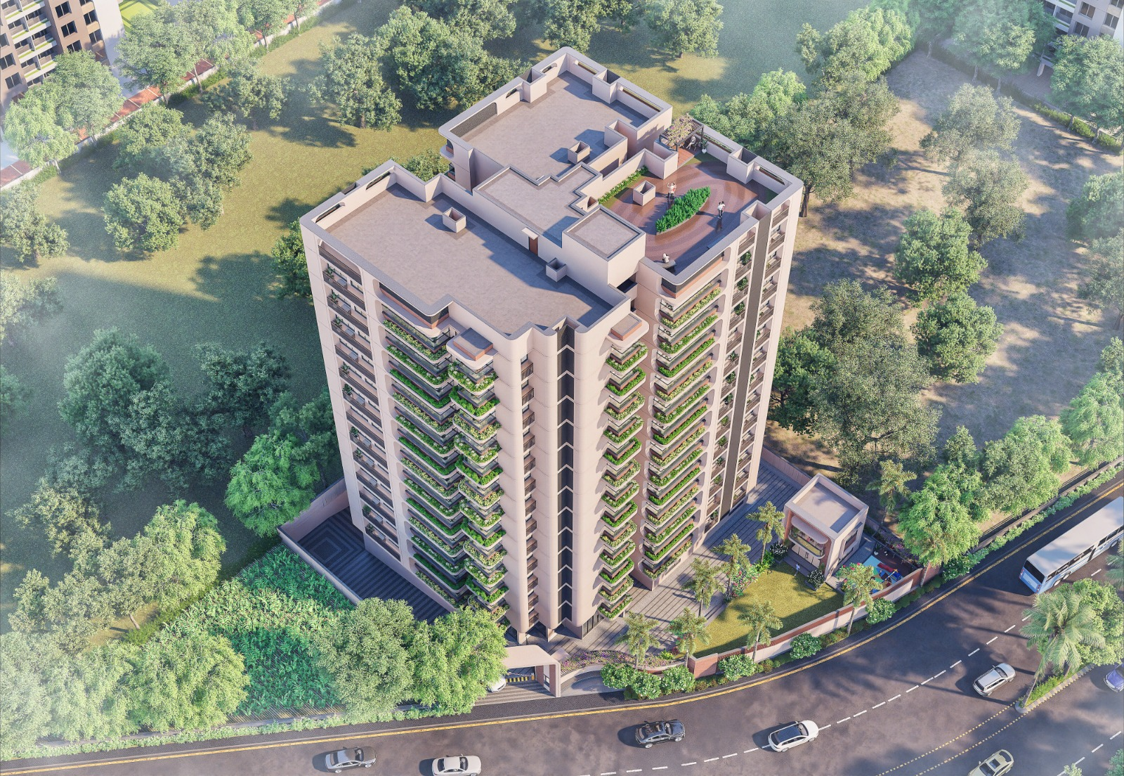 Earthland represents the pinnacle of Karm’s vision—a groundbreaking fusion of traditional Gujarati architectural elements with bold brutalist modernism. Rising 13 stories with just three expansive residences per floor, this vertical village creates intimate communities while preserving individual sanctuary. The 4 & 5 BHK homes offer extraordinary carpet areas, complemented by world-class amenities including a 250-guest banquet hall, meditation center, and terrace walkways that frame panoramic views of Ahmedabad’s evolving skyline.